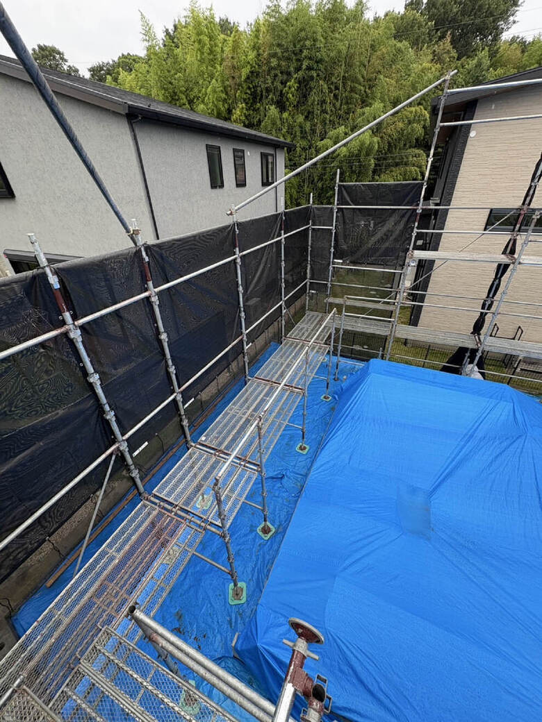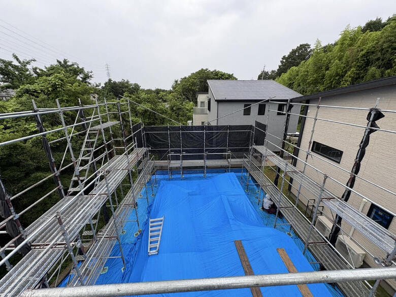 雨の予報なのでブルーシートで全て包み込んで養生します。
