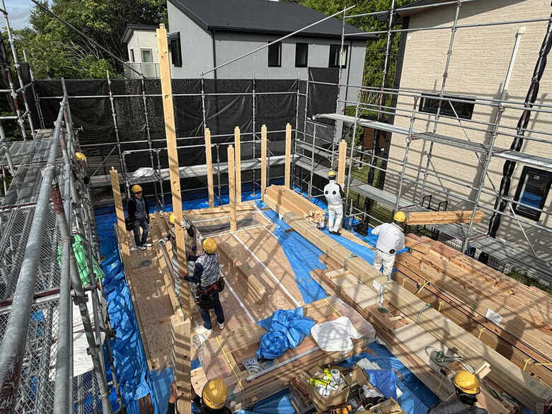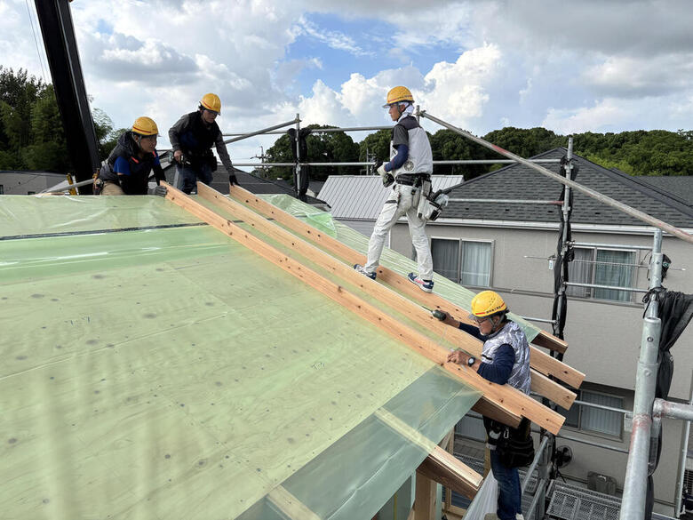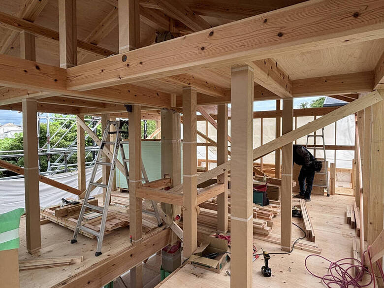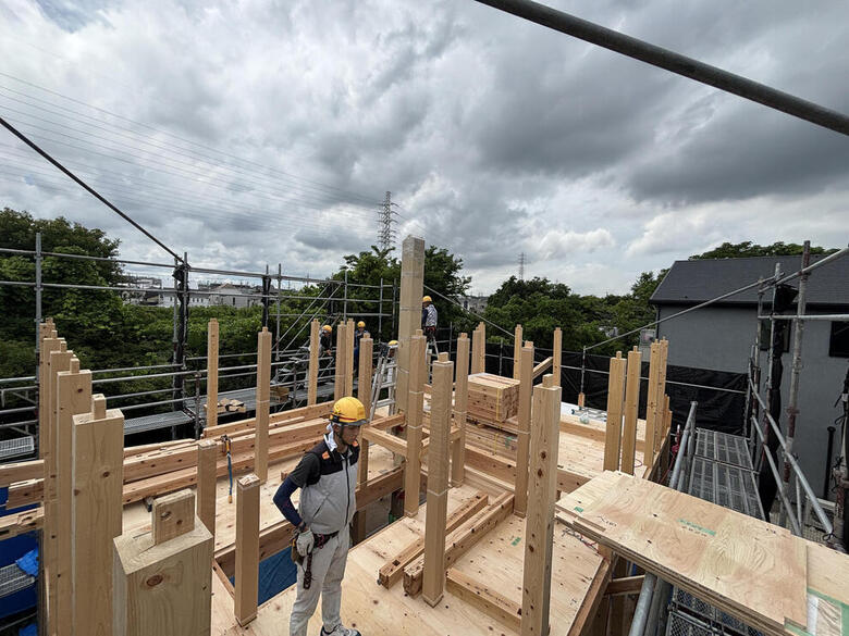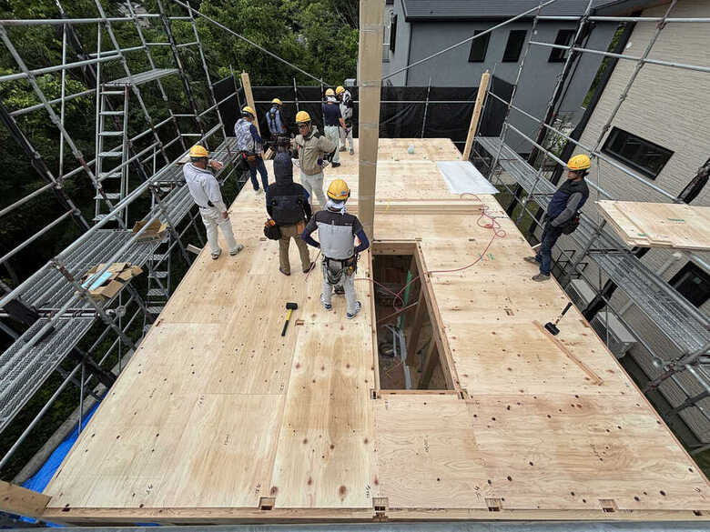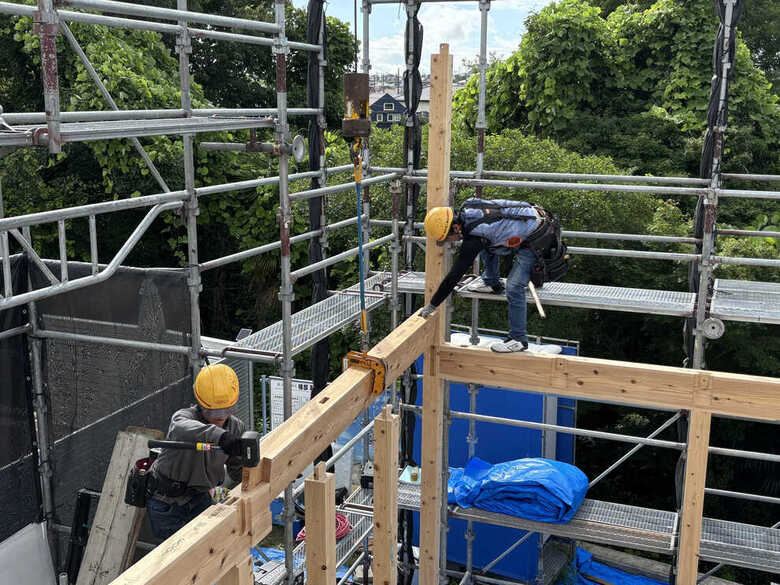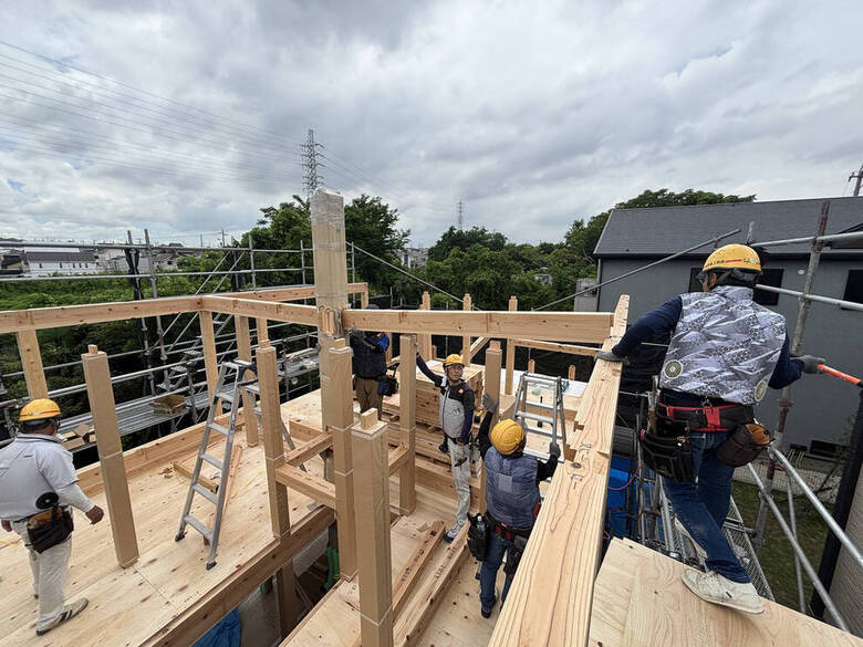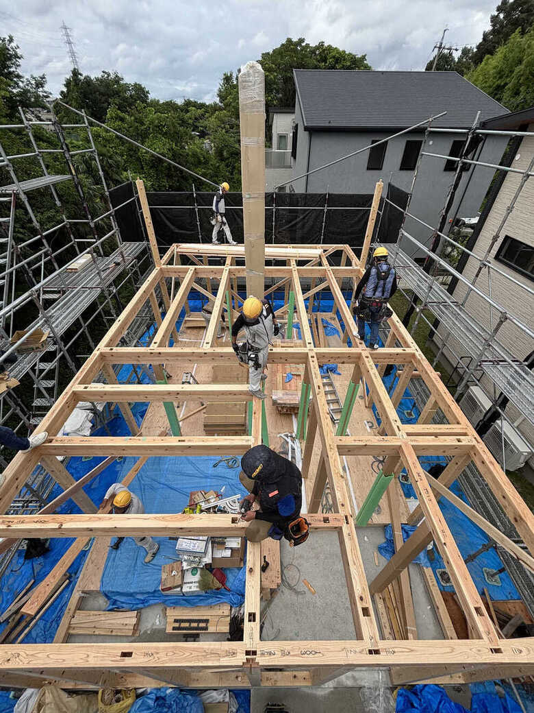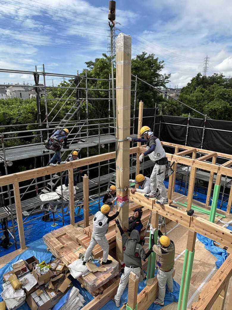 梅雨時で天候が不順だったので大工さんの人数を増やして、