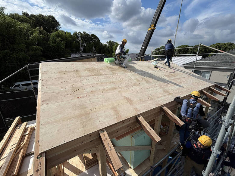 朝からの建て方を始めて夕方には屋根下地まで完了しました。