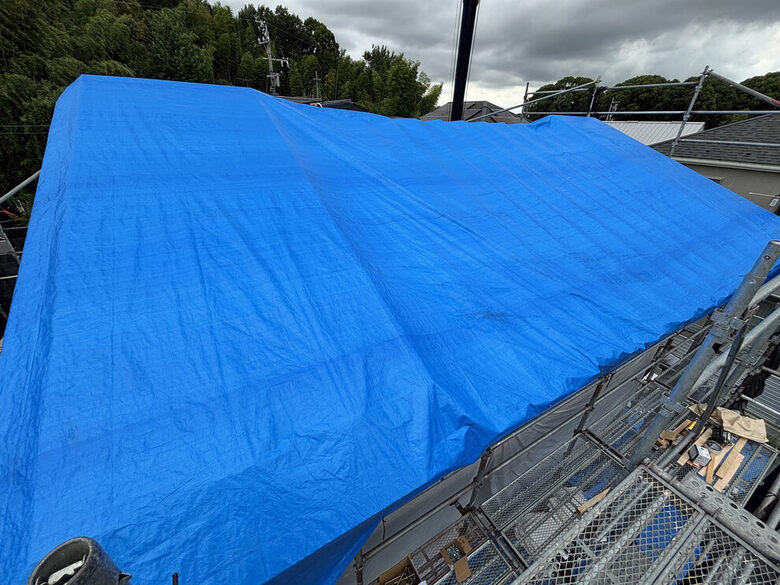 怪しい天気になってきたので屋根を全て覆って雨養生。