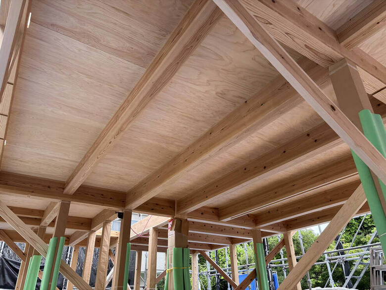 1階の天井と同様に桧の天井面が仕上がった状態です。