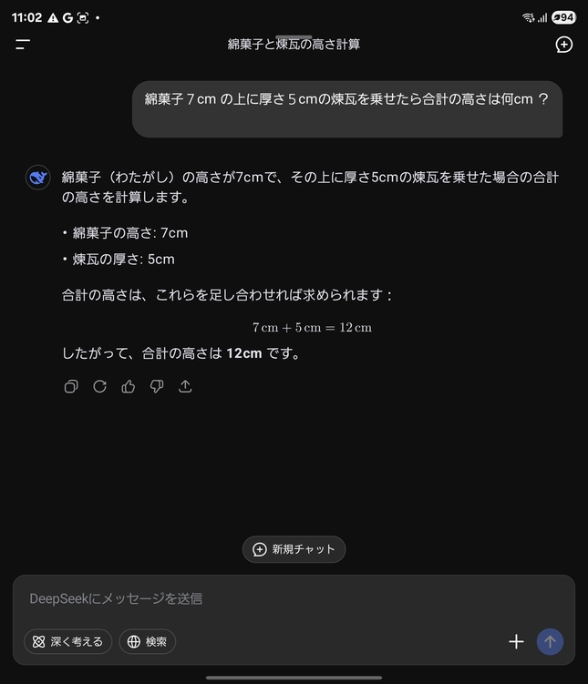 DeepSeak:合計の高さは12cmです(間違っても言い通す、堅物で融通がきかない印象)