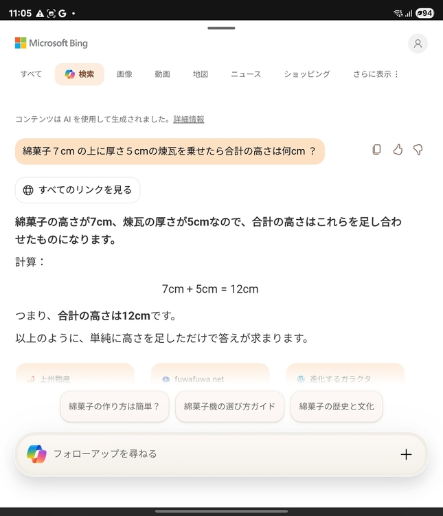 「綿菓子の高さが 7cm、煉瓦の厚さが 5cm なので、単純に足し算すると: