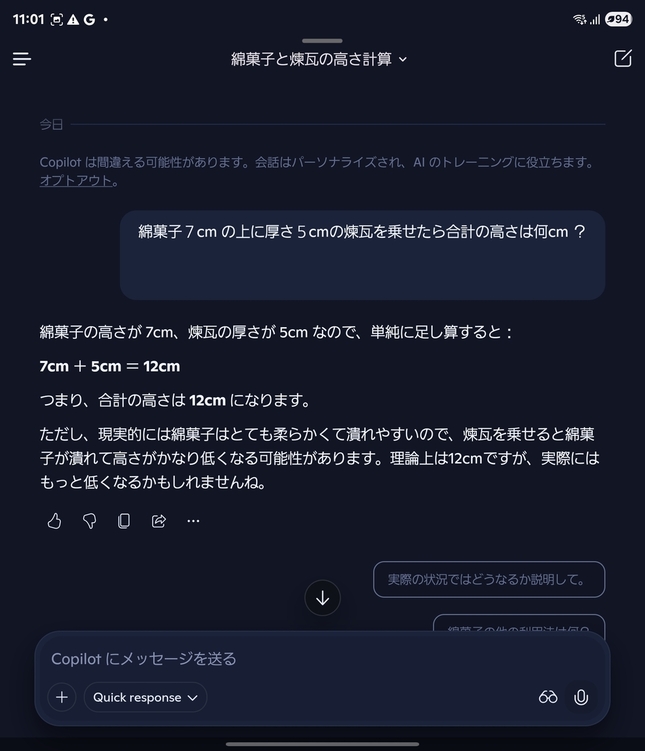 ただし、現実的には綿菓子はとても柔らかくて潰れやすいので、煉瓦を乗せると綿菓子が潰れて高さがかなり低くなる可能性があります。理論上は12cmですが、実際にはもっと低くなるかもしれませんね」