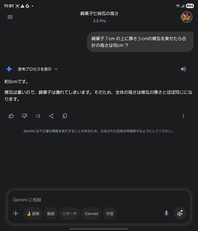 『綿菓子7cmの上に厚さ5㎝の煉瓦を乗せたら合計の高さは何㎝?』