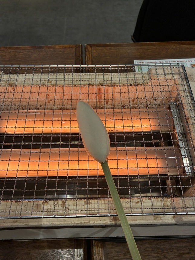 小さな炭火コンロで串に刺さった笹かまぼこを手に取り、いざ焼きスタート!