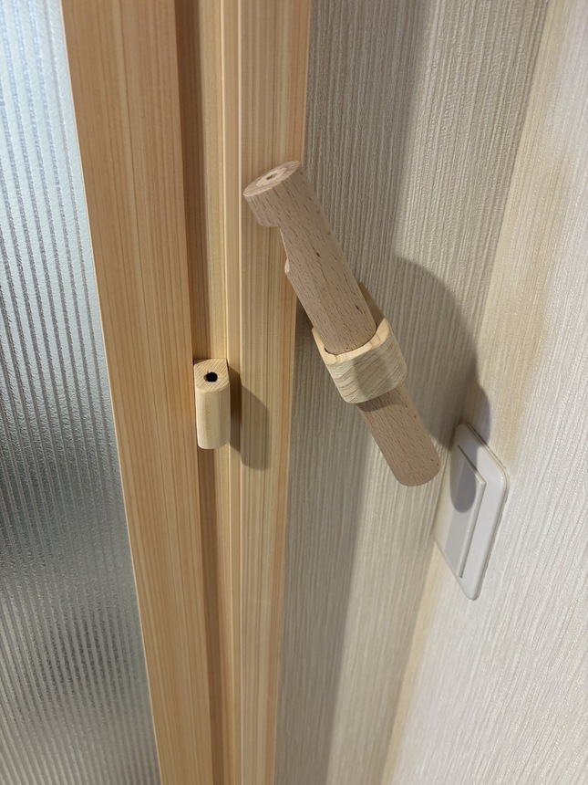 先日、お客様宅のリフォーム工事のご相談の中で「ネコちゃんの脱走対策」のお話しになり、玄関ホールの引戸に手作りのカギを作ってみました。