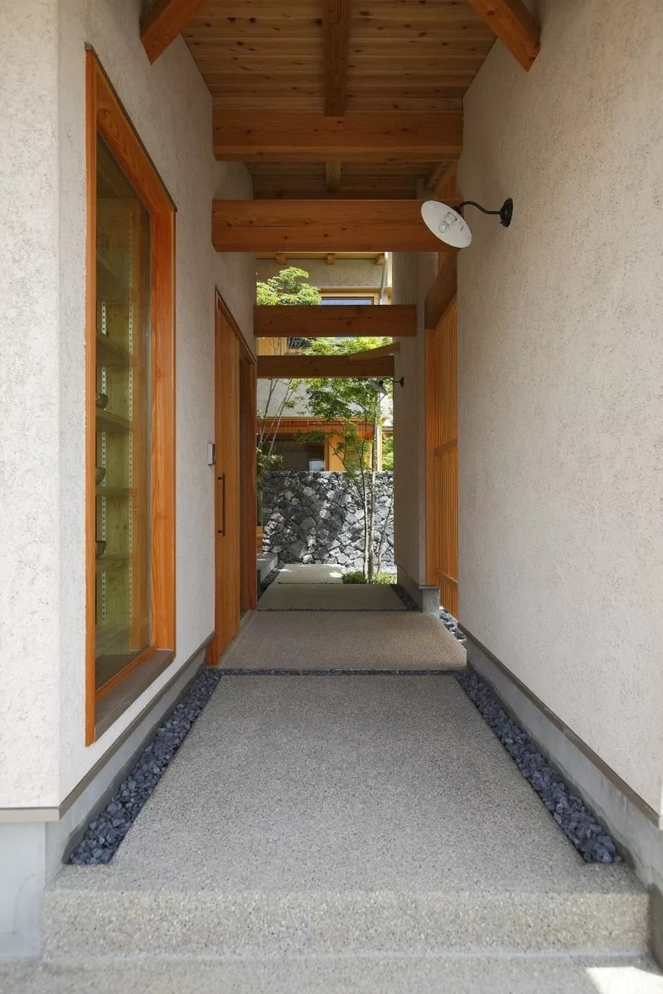 ひのきの木部のコントラストが美しいアプローチ。