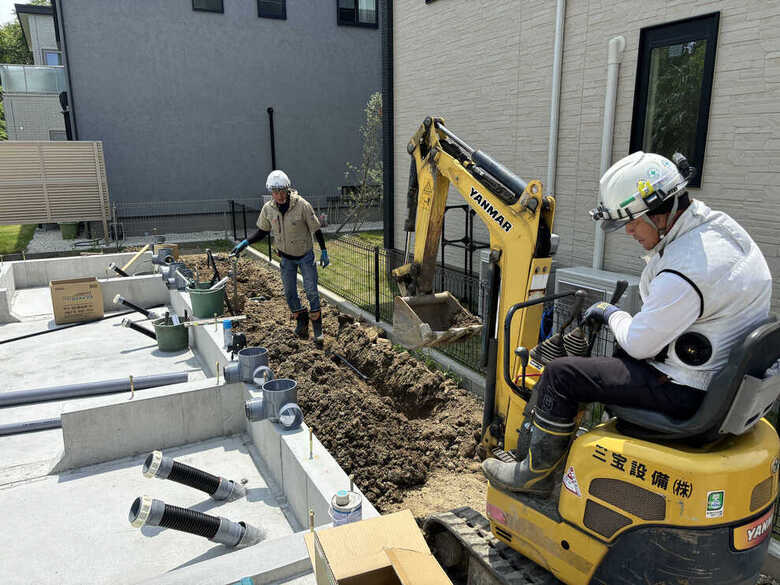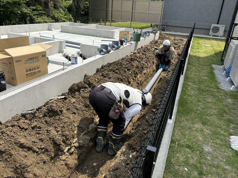建物内の排水管は基礎工事の際に既に配管されていますので、