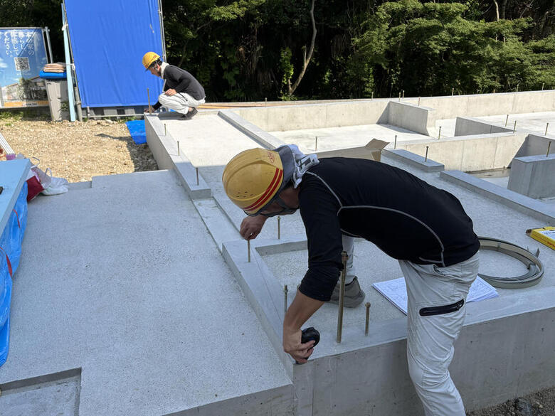 出来上がった基礎に土台を伏せるための墨を付ける(線を引く)ことです。