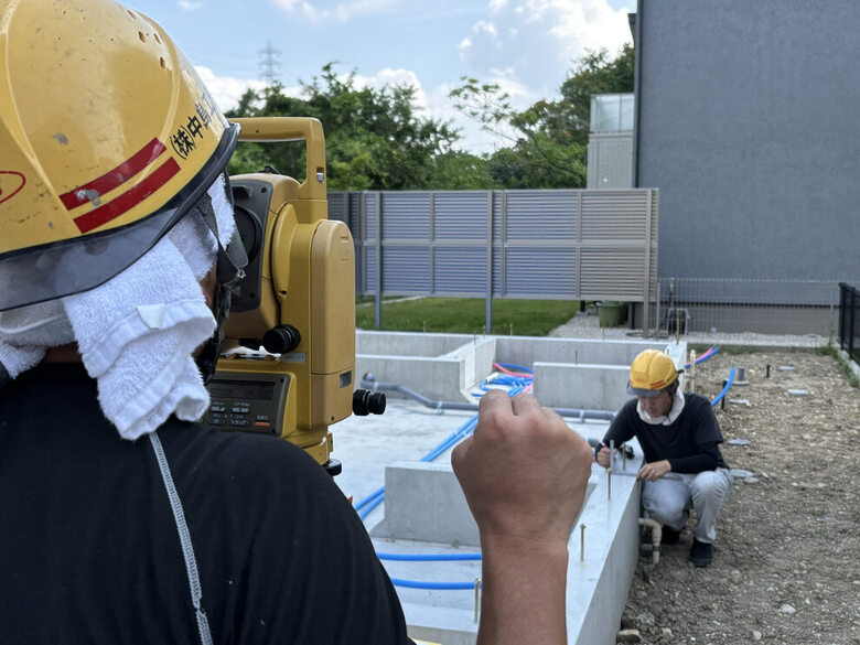 トランシットを覗くのは現場監督の奥村くん。