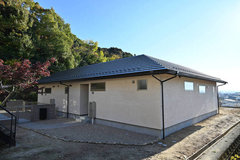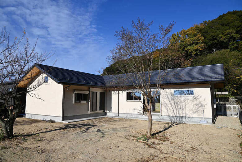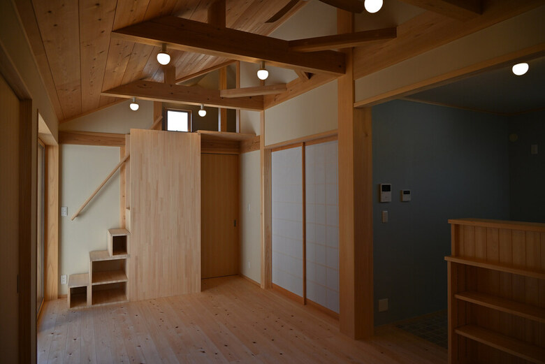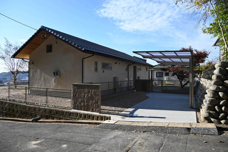 経年変化を楽しむ杉の軒裏や左官壁の外観。