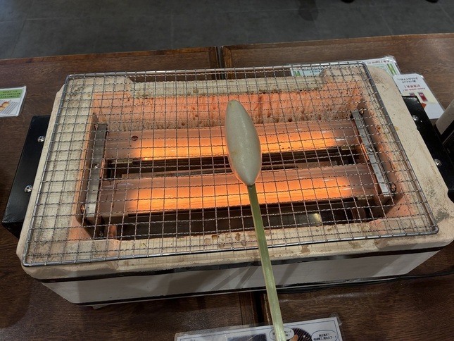 小さな炭火コンロで串に刺さった笹かまぼこを手に取り、いざ焼きスタート!