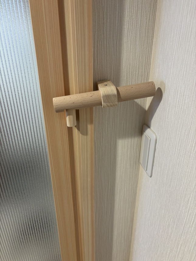 先日、お客様宅のリフォーム工事のご相談の中で「ネコちゃんの脱走対策」のお話しになり、玄関ホールの引戸に手作りのカギを作ってみました。